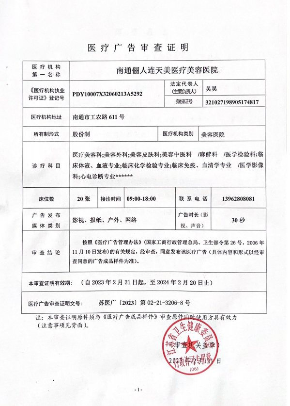 南通儷人連天美醫(yī)療美容醫(yī)院是與著名的醫(yī)療美容集團合作建立的醫(yī)院,醫(yī)院提供高品質(zhì)的醫(yī)療美容服務。2008年,南通儷人連天美醫(yī)療美容醫(yī)院落戶南通,成為由南通衛(wèi)生局審批的專業(yè)醫(yī)療美容醫(yī)院。南通儷人連天美醫(yī)療美容醫(yī)院,特別設有專業(yè)的整形美容科、皮膚美容科和微創(chuàng)美容科三大科室,致力于為廣大求美者提供全方位的醫(yī)療美容服務。南通儷人連天美醫(yī)療美容醫(yī)院為求美者建立個人終生美麗檔案,一對一進行細致服務。 11年來,南通儷人連天美醫(yī)療美容醫(yī)院,不斷引進先進設備,不斷完善醫(yī)美技術(shù),一批優(yōu)秀、專業(yè)而穩(wěn)定的醫(yī)生團隊,為無數(shù)求美者鑄就美麗夢想。